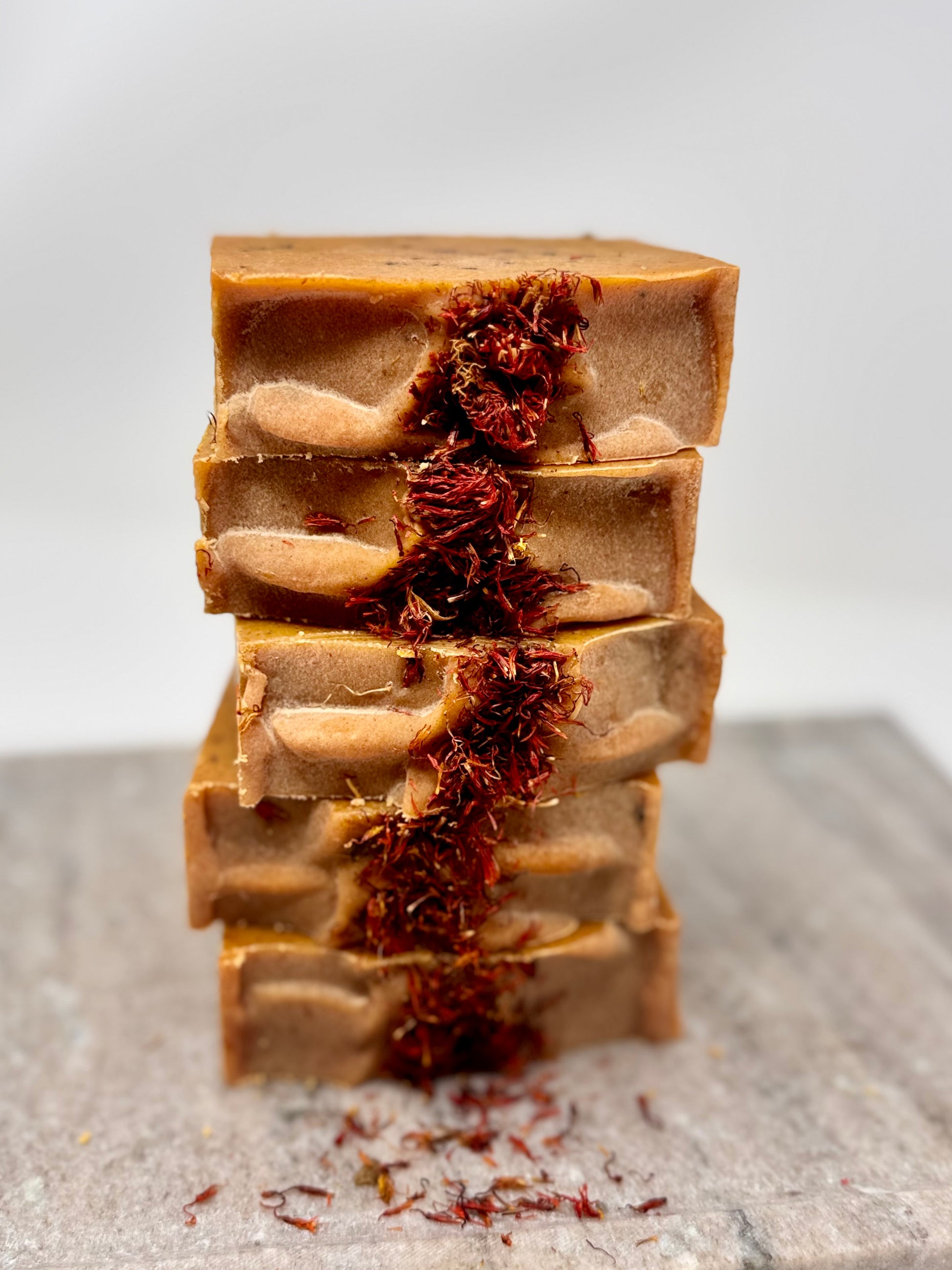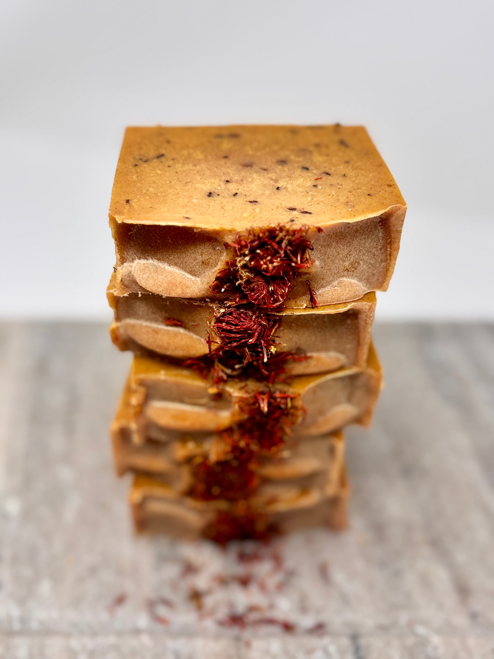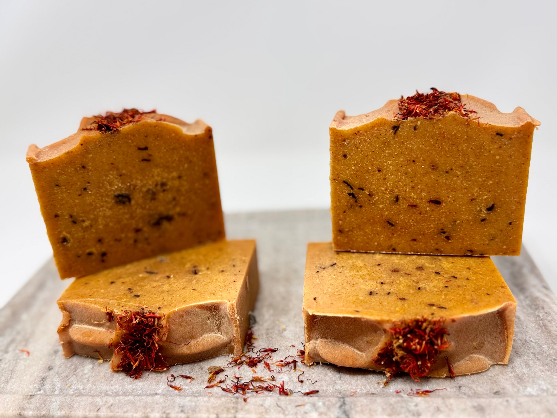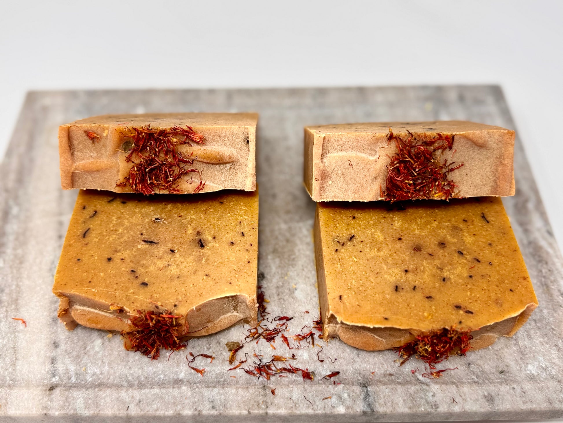 Rediscover radiant skin with this artisanal soap, thoughtfully blended to balance, brighten, and renew. Turmeric lends its golden touch, helping to even tone and bring out a natural glow, while mineral-rich bladderwrack seaweed replenishes and detoxifies with a wave of antioxidants. Nourishing goat’s milk softens and hydrates through its gentle lactic acid, and pure frankincense essential oil soothes the senses while encouraging skin rejuvenation. To complete this synergy, kojic acid works deep within the skin to fade dark spots, reduce hyperpigmentation, and promote a luminous complexion.